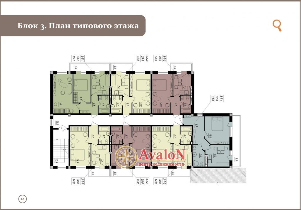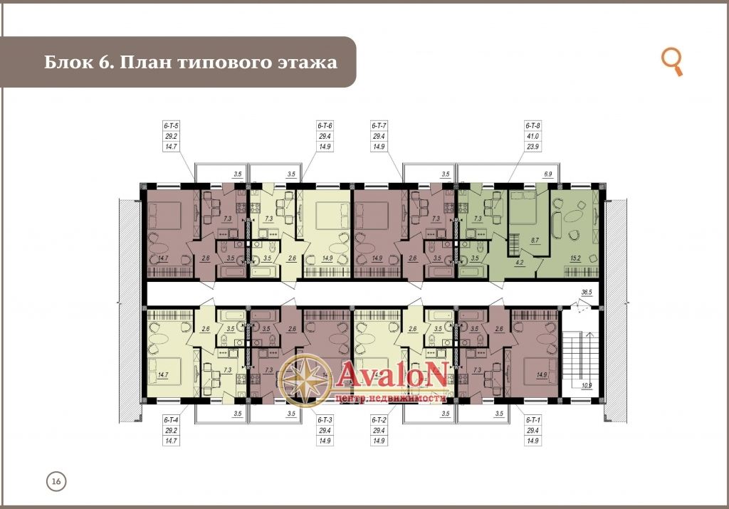 Комплекс включает в себя 6 секций, каждая секция имеет по 6 этажей